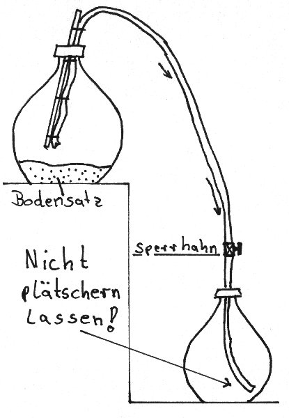 3. Es sollte verhindert werden, daß es zu einem Rücklauf in den oberen Ballon kommt ( Der Schlauch wurde z.B. zu hoch gehalten und hat Luft an gesaugt ), da sonst der Bodensatz aufgewirbelt wird.