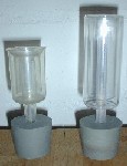 Der Linke Aufsatz im Bild ist der ältere und schönere von beiden. Es gibt die Ausführung in Glas und in Kunststoff, doch die Schweißnaht der Kunststoffaufsätze können Löcher haben und sind daher nicht zu empfehlen. Der Nachteil an der Form liegt in der Reinigung, da sie sehr gewunden sind kommt man nicht richtig hinein.